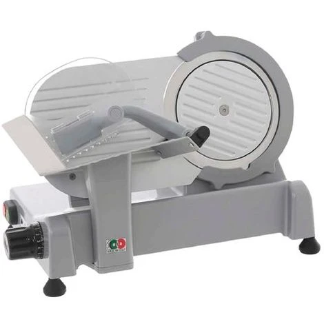 Per affettare carni, salumi, formaggi, pane. Corpo macchina in alluminio pressofuso verniciato, lama temprata rettificata in acciaio inox e cromata a cromo duro. Carrello su tubo in acciaio con boccole in acciaio e scorrimento su cuscinetto a sfera. Piedini in gomma antiscivolo, albero portalama su cuscinetti a sfera, vela, coprilama e piatto in alluminio con ossidazione anodica. Pressa in plastica acetalica per alimenti. Motore ventilato, accensione diretta con start e stop, manopola graduata. Spessore di taglio 0/15 mm. Alimentazione 230V/50Hz. Omologazione CE. Potenza 140 W.