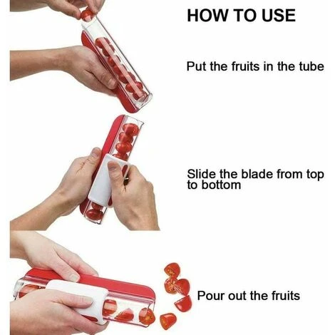 Questa affettatrice per frutta è adatta per affettare piccoli frutti come uva vergine e dividere la frutta a metà. Basta posizionare il frutto nel tubo e far scorrere delicatamente il tubo bianco lungo il perimetro, il frutto sarà facilmente diviso in due dal centro, pulito, ordinato e sicuro.