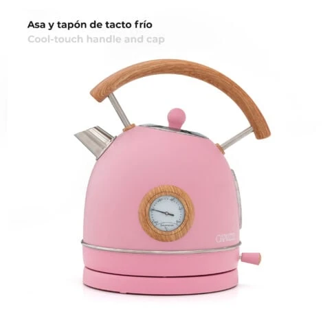 Un grande design unito alla migliore qualità. Il bollitore ad acqua calda ha una potenza elevata che consente di riscaldare l’acqua a 100º in 5,30 minuti, in modo da poter gustare rapidamente il proprio infuso preferito. È dotato di un filtro anticalcare rimovibile e lavabile che garantisce acqua pulita e insapore. La sua grande capacità di 1,8 l consente di non dover riscaldare costantemente l’acqua. Inoltre, il suo design vintage con finiture opache e in legno aggiungerà un tocco di originalità alla vostra cucina. Questo bollitore in acciaio è dotato di un termometro integrato per controllare la temperatura e di una finestrella per individuare la giusta quantità di acqua. Il suo sistema di spegnimento automatico è in grado di rilevare il surriscaldamento e di spegnere il dispositivo.nnCaratteristiche:n- Dimensioni: 25x21x27,5 cm.n- Materiale: acciaio inox e polipropilene.n- Senza BPAn- Capacità: 1,8 L massimo.n- Colore: rosa opaco.n- Peso: 1,08 kg.n- Potenza: 2200 W.n- Temperatura di lavoro: 100° C.n- Sistema di sicurezza: Autoshutoff.n- Filtro: acciaio inox.n- Protezione del cavo: Sì.n- Lunghezza del cavo: 75 cm.n- Certificati: CE, GS, LFGB e RoHS.