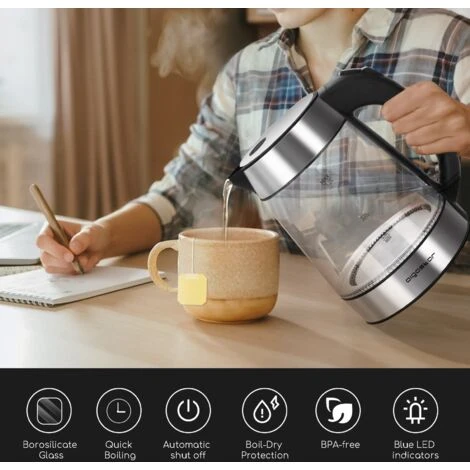 Bollitore in vetro borosilicato da 1,7 litri (per 3-5 persone) con illuminazione led blu e filtro rimovibile.