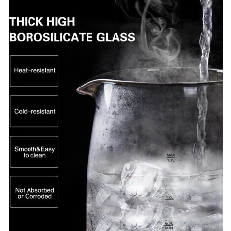 Capacit da 1.7L. Realizzato in vetro borosilicato di alta qualit , durevole e resistente alle macchie. Potenza da 2200W, permette di bollire l’acqua in modo veloce ed efficiente.