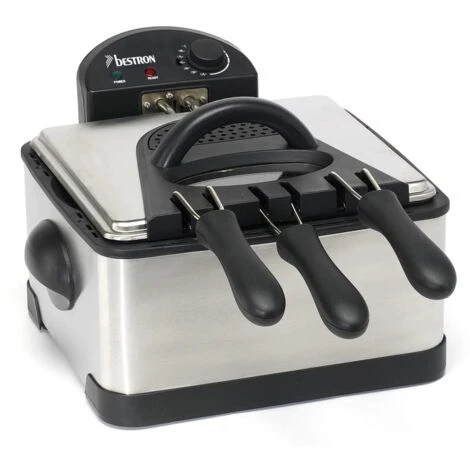 La friggitrice comoda Bestron DF402B di 4,5 L in acciaio inossidabile è dotata di 3 cestelli per friggere. Il coperchio è dotato di un finestrino ed un filtro sostituibile anti odori. Il manico è realizzato in materiale resistente al calore.