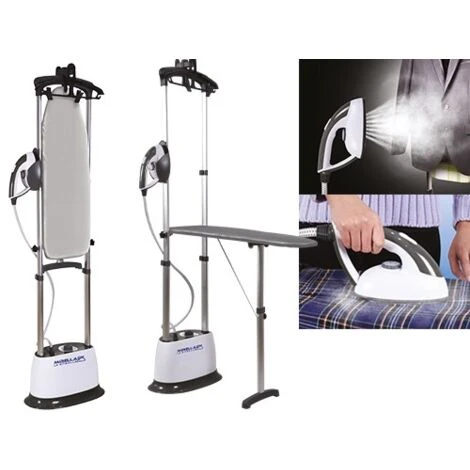 Asse da stiro pieghevole e richiudibile. Potenza 2200-2400 Watt, capacità serbatoio 1000 ml., pre-riscaldamento 3 min., periodo di lavoro 30 min., pressione max 4 bar., temperatura regolabile max 130 °C, vapore 2in1 regolare + getto.