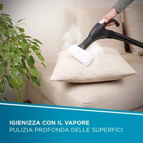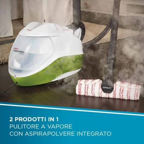 Pulitore a vapore con caldaia ad alta pressione 6 Bar e aspirapolvere integrato, 2 prodotti in 1 per semplificare la pulizia completa di tutta la casa. I 10 programmi automatici di pulizia, con la dotazione di accessori, consentono di trattare al meglio tutte le superfici lavabili: pavimenti, parquet, tappeti, divani, rubinetti, sanitari, specchi e vetri. La tecnologia di aspirazione con filtro ad acqua permette di aspirare sia sporco secco che liquidi. Misure (LxPxA): 49 x 32 x 33 cm. Contenuto della confezione