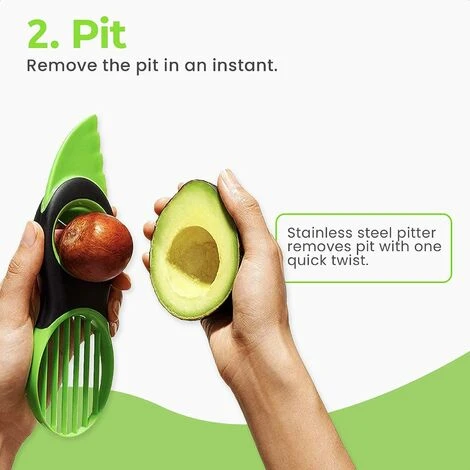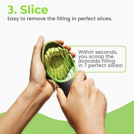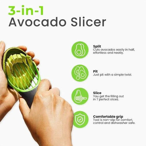 “� TUTTO IN UNO – Questo è il gadget da cucina di cui hai bisogno per fare quello che vuoi con gli avocado. Puoi dividere gli avocado snocciolandoli, raccogliendoli e affettandoli. Un guacamole perfetto !� Safe Blade – L’affettatrice per avocado è completamente sicuro da usare Grazie alla lama appositamente progettata, anche gli anziani e i bambini possono tagliare l’avocado senza il rischio di tagliarsi. piatti più deliziosi in un batter d’occhio! , taglierai, denocciolerai e detorsoli i tuoi avocado in un batter d’occhio!� NESSUN RIFIUTO – Il design intelligente dell’affettatrice per avocado ti consente di rimuovere rapidamente noccioli e polpa dagli avocado.Pertanto, non può essere ossidato.”