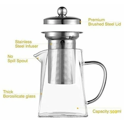 Teiera in vetro per uso domestico: teiera in vetro super trasparente da 500 ml con infusore in acciaio inossidabile per aiutarti a raccogliere il tè galleggiante e facilitarti la macerazione. Teiera sfusa o profumata per 2-3 persone