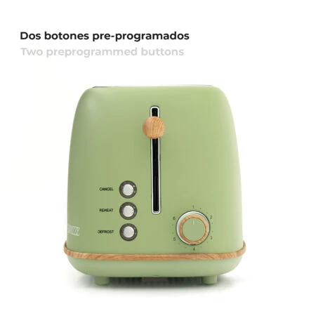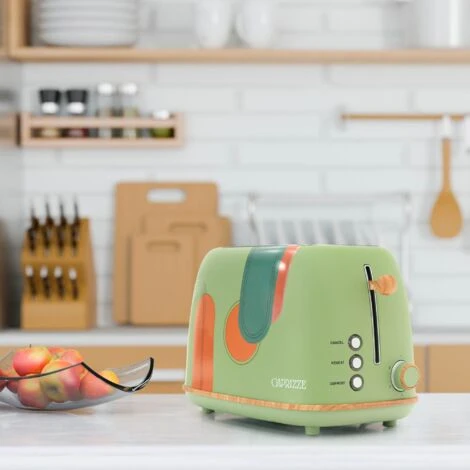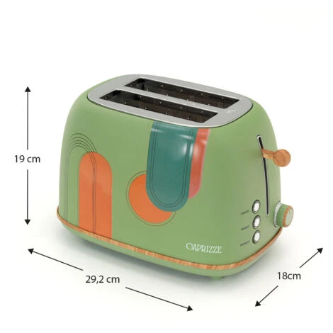 Il tostapane Caprizze Kaito è perfetto per gli amanti del design e della buona tavola. I toast saranno tostati alla perfezione grazie ai 6 livelli regolabili. Dispone di due fessure extra larghe di 3,8 cm e 13,5 cm di lunghezza per poter gustare qualsiasi tipo di pane. Le tre funzioni integrate consentono di riscaldare, scongelare e interrompere la tostatura. Il tostapane, realizzato in acciaio inossidabile, è dotato di un vassoio raccoglibriciole e di un raccoglifili. Per una maggiore sicurezza, è dotato di piedini antiscivolo integrati e del sistema Auto Stop che spegne automaticamente il tostapane per evitare cortocircuiti.nnCaratteristiche:n- Misure: 29,2x18x19 cm.n- Materiale: acciaio inox e polipropilene.n- Colore: verde opaco con decorazioni arancioni e dettagli effetto legno.n- Peso: 1,20 kg.n- Potenza: 815W Basso consumo.n- Temperatura di lavoro: 6 livelli e 3 funzioni.n- Sistema di sicurezza: Autostop.n- Termostato: Sì.n- Vassoio raccogli briciole: Sì.n- Base antiscivolo: Sì.n- Controllo: Analogico.n- Lunghezza del cavo: 75 cm con protezione integrata.n- Voltaggio: 220-240V.n- Regolatore di temperatura: Sì.n- Certificati: CE, GS, LFGB e RoHS.