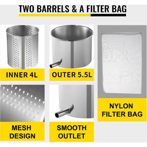 - 【CONVENIENTI DOPPI BOTTI】 – Con i due barili di acciaio inossidabile, 4 L interno e 5,5 L esterno, che sono posizionati proprio sotto la piastra di pressione durante la spremitura, è possibile ricevere un effetto ideale per separare la feccia e il succo. Il succo scorrerà attraverso le maglie del barile interno e l’uscita di quello esterno, per poi essere raccolto nel vostro contenitore. Inoltre, viene offerto anche un sacchetto filtro in nylon per evitare schizzi.